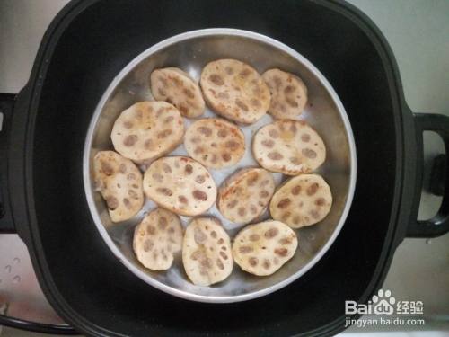 在煎好的莲藕片酿肉表面撒上一点盐和几滴豉油,锅中加水烧开,大火蒸30分钟即可。