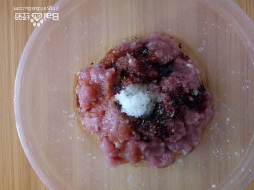 将猪瘦肉白色筋清除干净,剁成肉末,加入干葱头末,1勺盐,2勺食用油,1勺豉油,半勺老抽和少许黑胡椒粉,搅拌均匀;