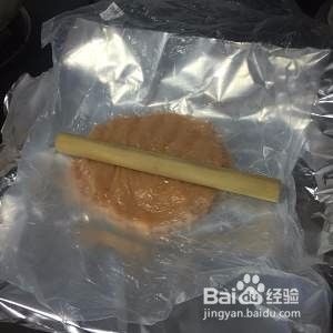 锡纸上均匀的抹一点油。把鸡肉泥放上去。用保鲜袋剪开铺在鸡肉泥上面。