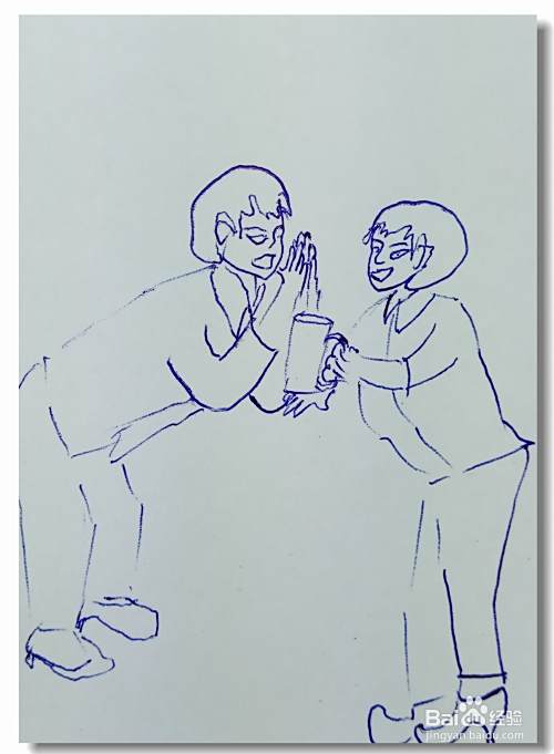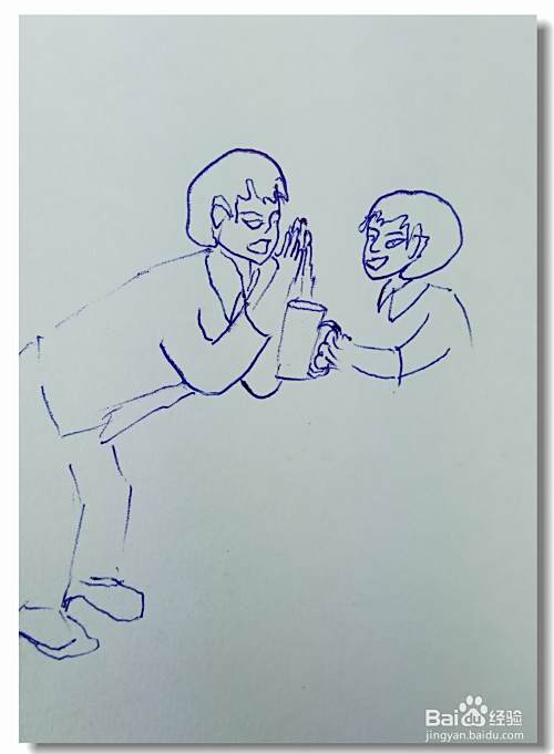 画出左边人的腿部,他弯着腰,准备接过水杯里的水。