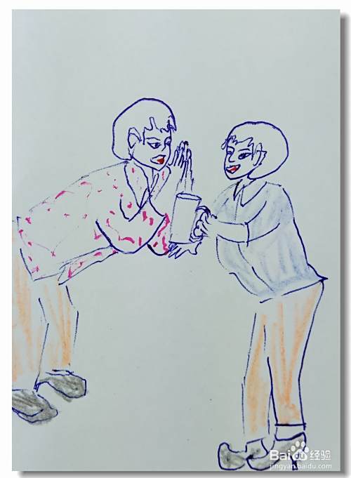 用色彩涂出他们所穿衣服的颜色,画出背景,简笔画就画好了。