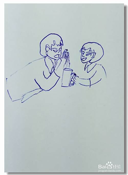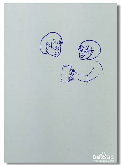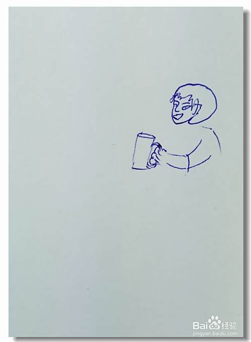 在白纸上画出一个人的头部轮廓,并画出他的眼睛,鼻子和嘴巴部分,然后再用曲线画出他的头发和胳膊,再画出他手里端着的一杯水。