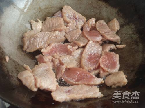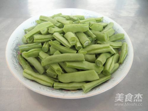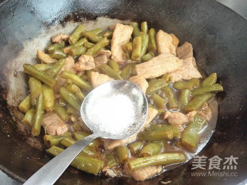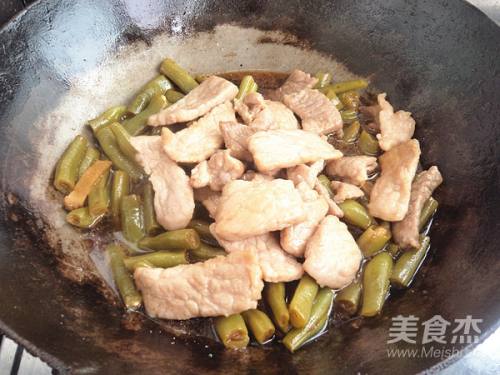 8焖至豆角7、8分熟时,将过油后的肉片入锅炒均匀,盖上锅盖一起焖,其间还要适时翻炒。