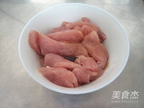 2猪里脊肉洗干净,切成稍微厚些的片,加盐、生抽、料酒搅拌均匀。