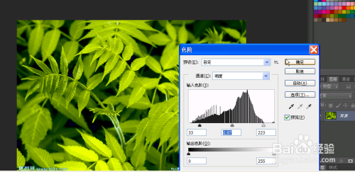 点击图像-调整-色阶,明度数据为:黑33,灰0.97,白223,然后点击确定。