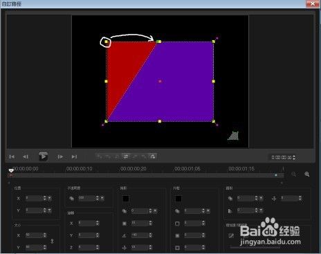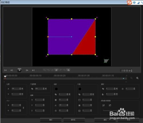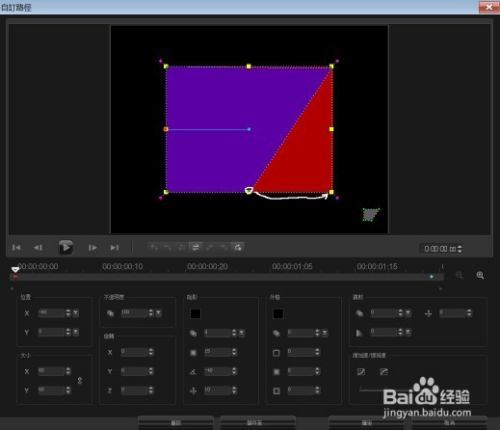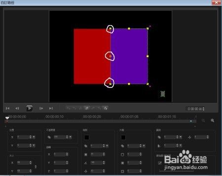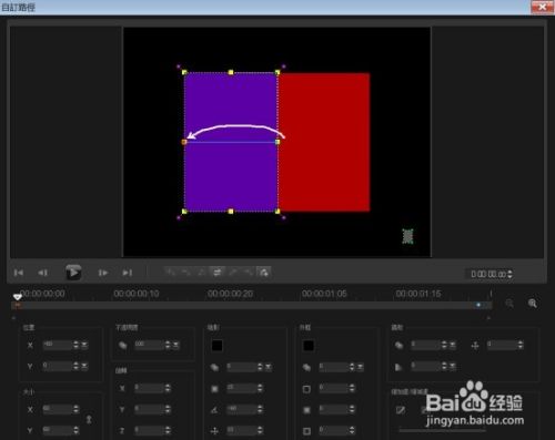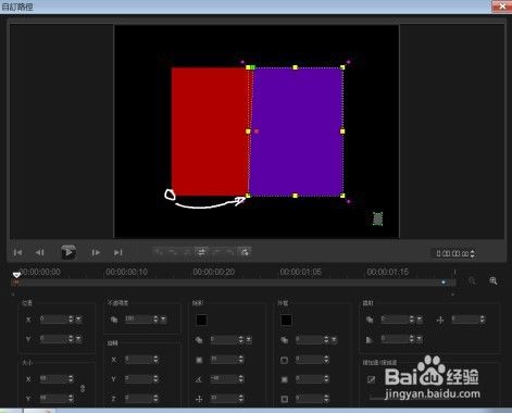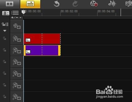 1.设复叠轨2条,在复叠轨一和二分别导入一张图片,区间长度不限,这两张图片要求大小规格一致,但颜色差别要大,以便制作时看得明显。(我是直接用色块)。由于会声会影自定义路径中没有移动中心点的参数值,所以移动中心点是完全手工制作,为了移动中心点以后能与原图片不变形,所以用复叠轨一的图片作大小规格的参照,在复叠轨二的图片上来制作移动中心点。