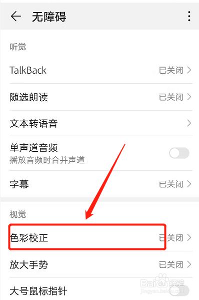 在无障碍页面,点击色彩校正。