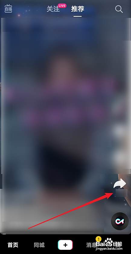 第二步,进入到视频首页中,往上滑动视频,选择一个视频进行合拍,点击【分享】符号;