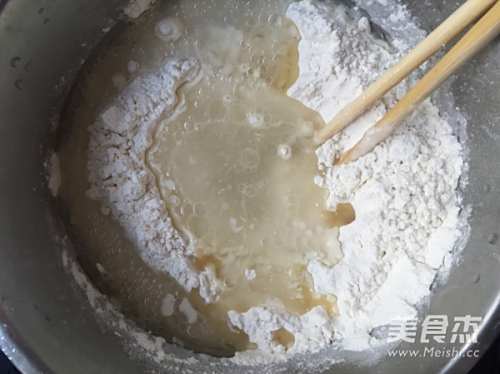 9另取一盆等量的面粉,加入水,食用油,用筷子搅拌