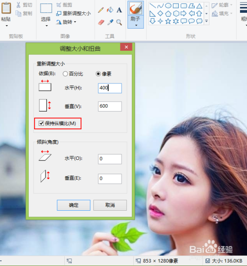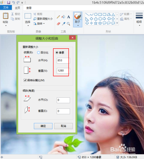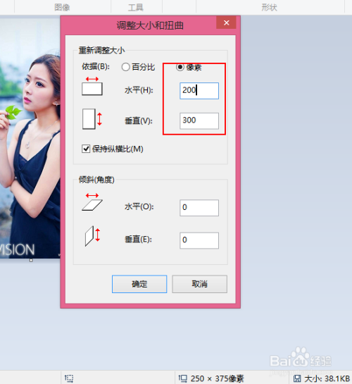点击”重新调整大小“,在出现的对话框里选中”像素“,不要取消”保持纵横比“前面的√,否则照片等下会变形。