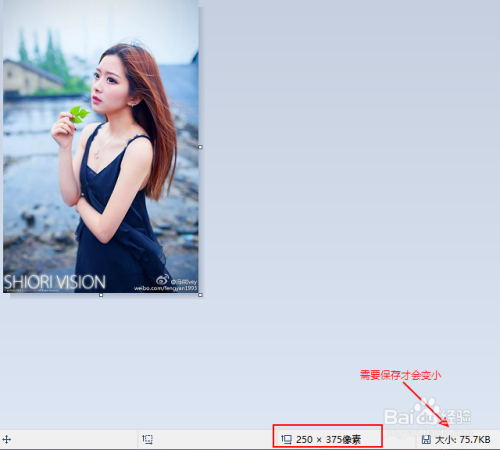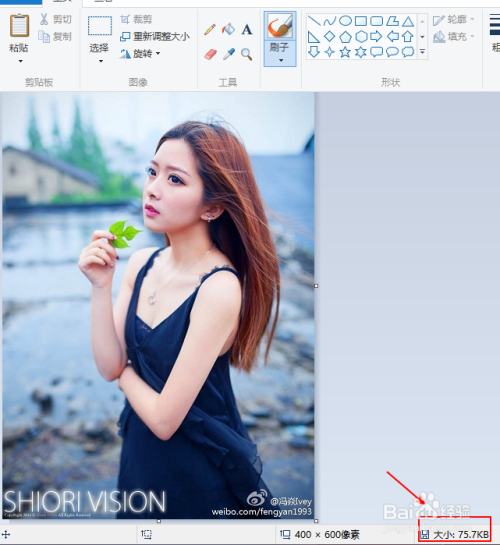 选择”文件“--->"另存为”-->“JPEG",在出现的另存为对话框里选取自己想保存相片的地方,此时如不想存为”JPEG“格式还可以在”保存类型“里更改,然后”确定“。存好后如图。文件大小已变小为75K。