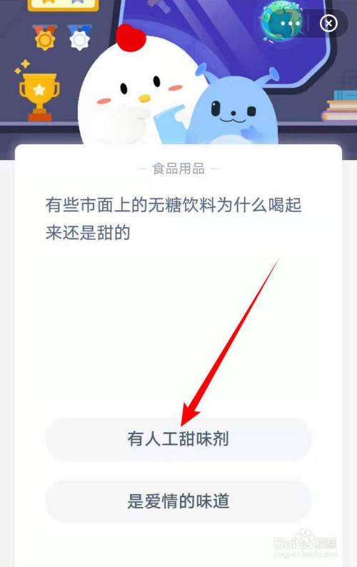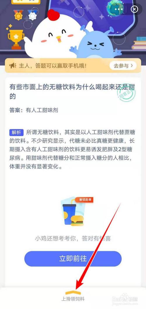 在答题页面,无糖饮料是甜的,点击有人工甜味剂,解析说明了甜味剂,点击上滑领饲料;