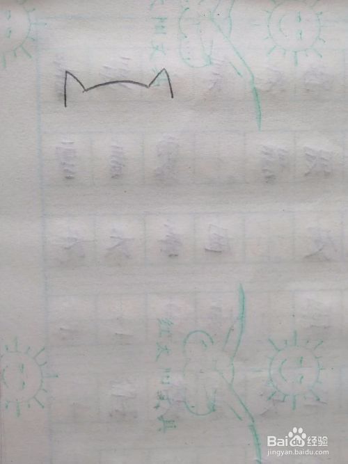 第一步画一条弧线,两头画上三角,这样就画好了小猫的头顶和耳朵。