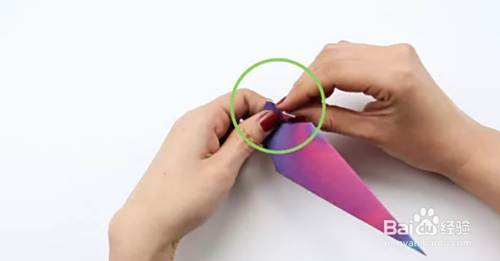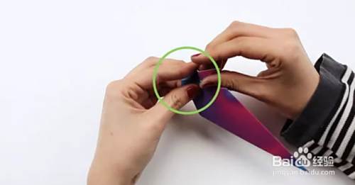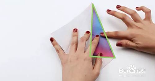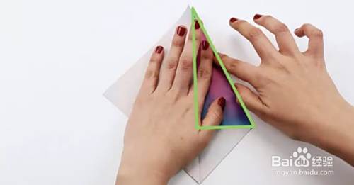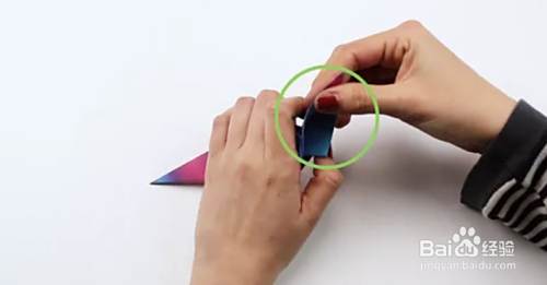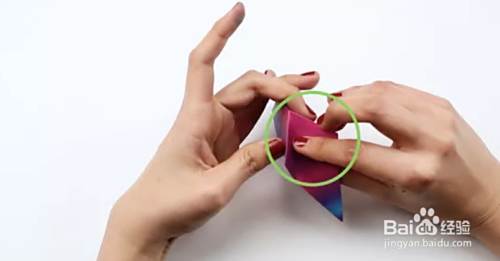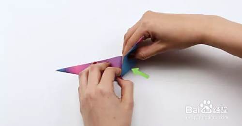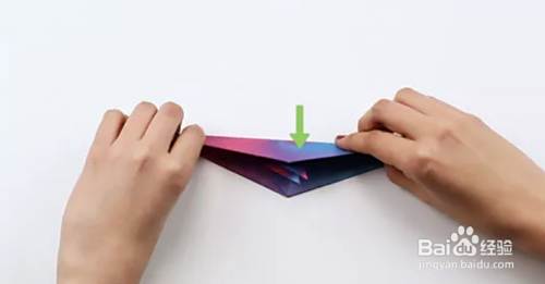 将顶点向下折成一个角度,然后再向上折。展开。