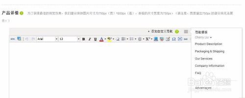 产品详情部分,可以根据自己产品的需要详细填写规格,特点,应用,包装和服务等细节。注意信息要尽量详细,文字,表格和图片都要有哦。还可以添加各部分的导航。信息填满后点确认就ok了