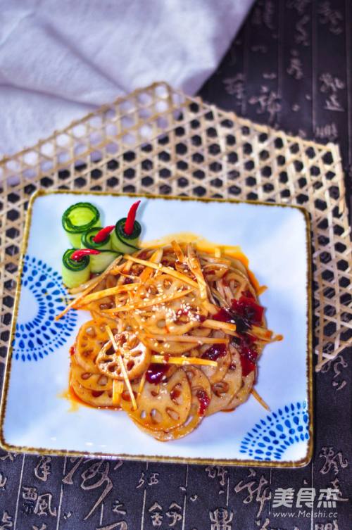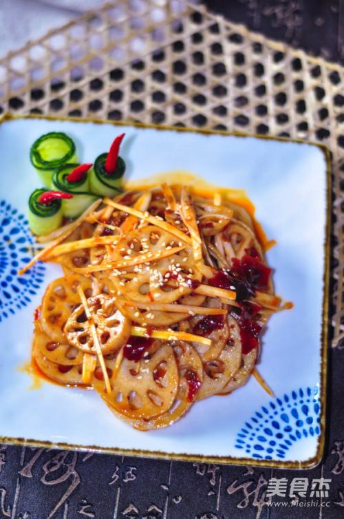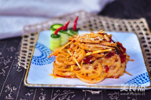 9莲藕片控干水份放入碗里,加入葱白丝,淋上晾凉的豆瓣酱,拌匀。撒上白芝麻点缀即可。END