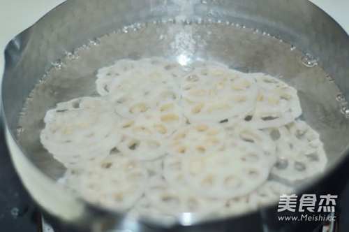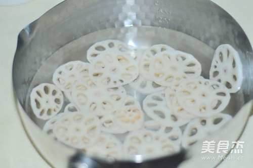 4焯烫好的莲藕片,放入冰水中浸泡,洗去表面的粘液,这样可以让莲藕口感变脆。