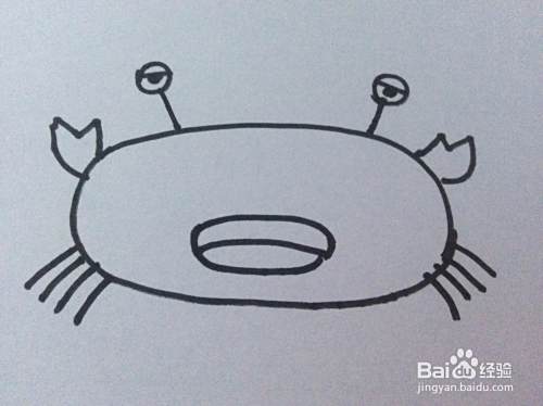 在椭圆形内部的中间偏下位置,画出螃蟹大大的嘴巴。螃蟹的嘴巴是椭圆形的。