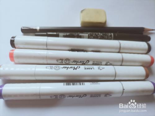 准备好我们要用到的材料:一支铅笔、一块橡皮、一支勾线笔(含有粗细两头)、一些马克笔和一张白纸。