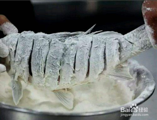 把清洗好的鱼拿刀在鱼的肚子上划几刀均匀的抹上盐入味,然后用淀粉把鱼包裹起来涂满。