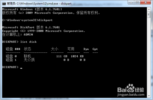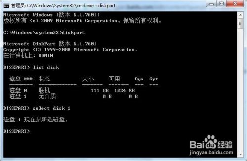 然后在命令提示窗口下输入“select disk 1“后回车,就会显示磁盘1现在是所选盘。