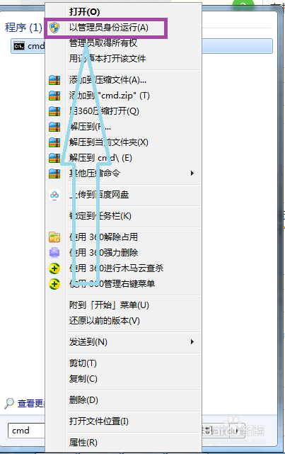 右击“cmd.exe”,弹出右击的下拉子菜单,在子菜单中找到“以管理员身份运行”,
