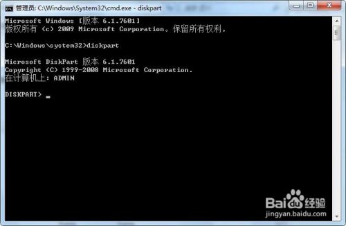 在命令提示窗口下输入“diskpart“后回车,显示Diskpart 版本及以后计算机称号,