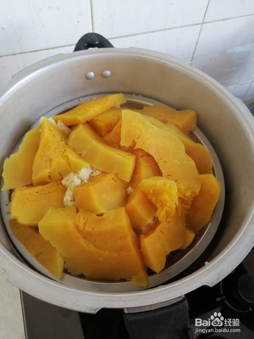 将南瓜和小米一同上锅蒸熟,把南瓜压成南瓜泥,和小米掺合在一起。