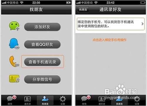 切换到"找朋友"的界面。点击"查看手机通讯录"。如果您还没有绑定手机号,系统会提示您先绑定手机号,这样系统才能为您找到手机通讯录中正在使用微信的好友。