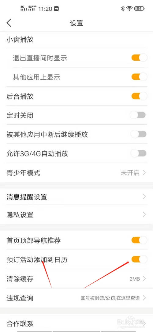 进入设置的页面,点击预定活动添加到日历后的开关按钮,点击选择打开即可。