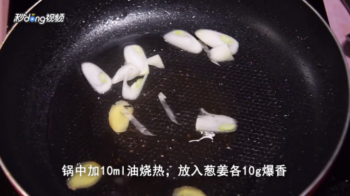 2锅中加油烧热,放入葱姜蒜各10g爆香,加入600g肉块,10ml酒煸炒至肉块变黄。