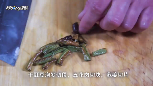 1干豇豆泡发,切段,五花肉切块,葱姜切片。
