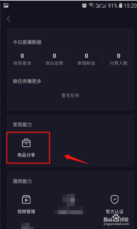 4、在创建者服务中心页面,点击变现能力中的“商品分享”,进入商品窗口页面,如下图标记所示;
