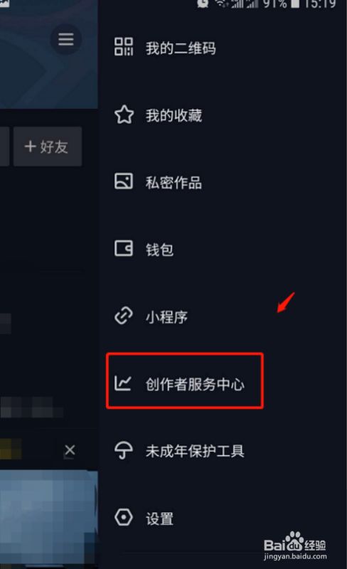 在弹出窗口中点击“创作者服务中心”,进入创作者服务中心页面,如下图标记所示;