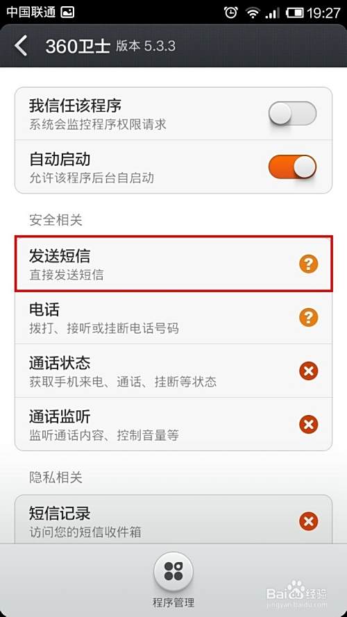 相信现在很多的手机里安装有360安全卫士,因为现在的手机安全问题确实很让人担心,安装360安全卫士保护手机也无可厚非,可是我们总是发现360总是提示发送短信,或者读取短信,实在烦人,那么怎么取消这个提示呢,下面说一下