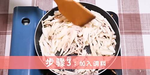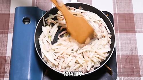2加入葱、姜、鸡腿菇,继续翻炒。