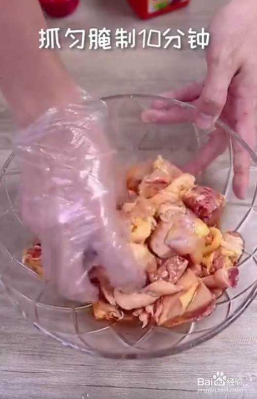 把鸡肉和盐、糖、料酒、胡椒粉、酱油搅拌腌制1小时