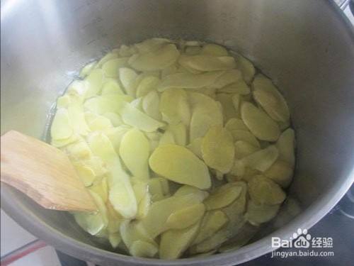 生姜洗干净去皮,用刀切成薄片,放入水中浸泡两个小时,捞出沥水。