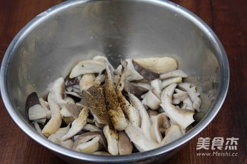 4将蘑菇放盆里,加适量的盐,喜欢吃孜然的加点孜然粉,加适量鸡精,腌制10分钟入味(饭店很多不加盐和调料,炸完之后蘸椒盐吃也可以)