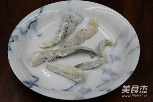 7将蘑菇拿起,轻轻抖落表面的淀粉,放盘里