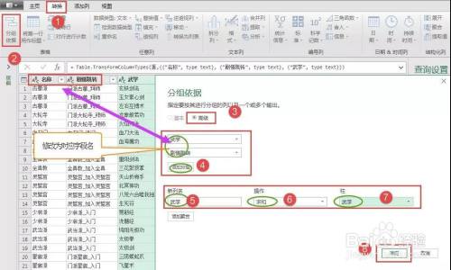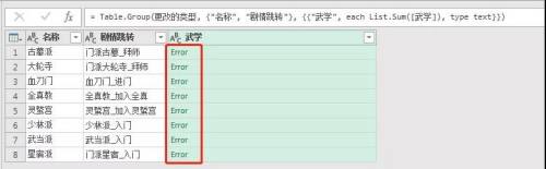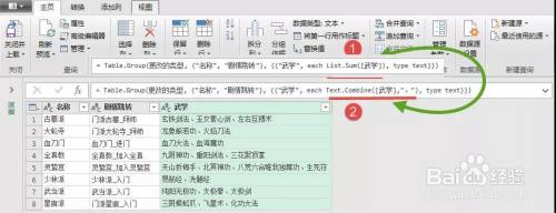 我们把List.Sum([武学])改为Text.Combine([武学],”、”),回车。【武学】字段列中全部组合起来了。然后点左上角【关闭并上载】完成。