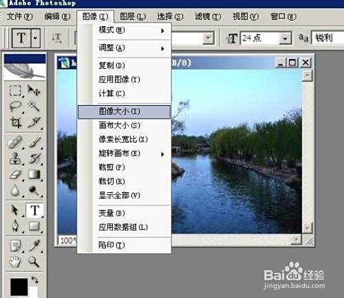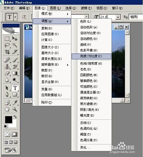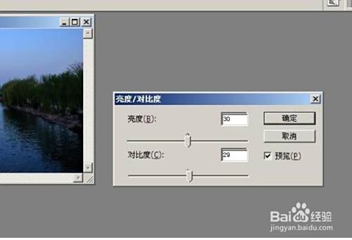 用photoshop打开c:\ks\hushui.jpg,并对该文件进行以下操作:先将图像亮度调整为30、对比度调整为29,再将图像大小修改为宽800像素、高600像素(去掉约束比例),并以hs.jpg为文件名保存在当前文件夹下