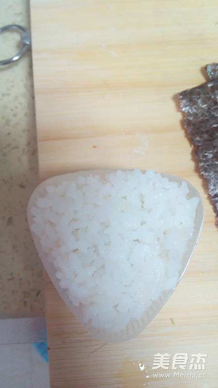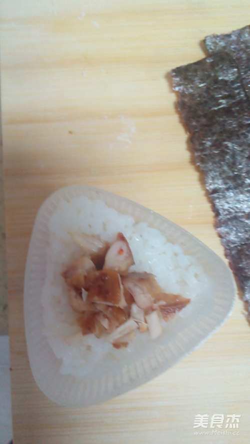 9拿三角饭团的模具,下面铺一层米饭,中间放鸡肉