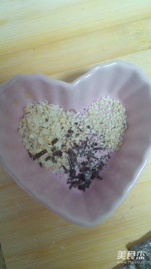 8花生仁150度10分钟提前烤箱,切碎。白芝麻、海苔碎和花生仁放到一起,搅拌均匀做表面沾料