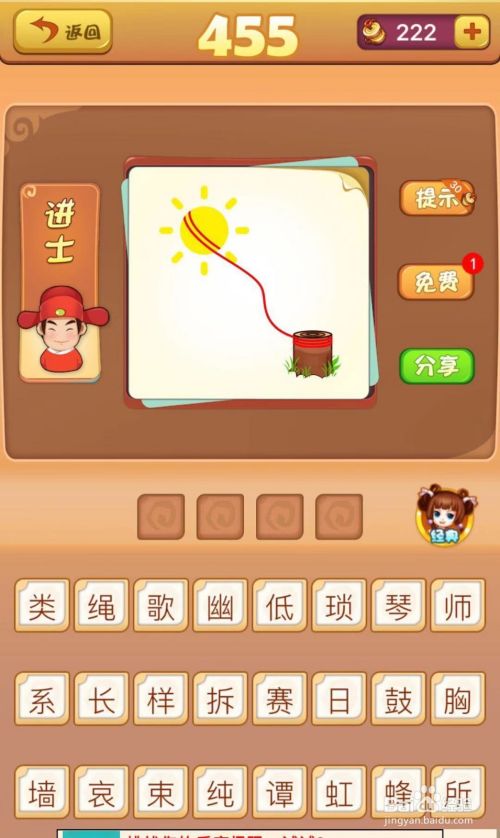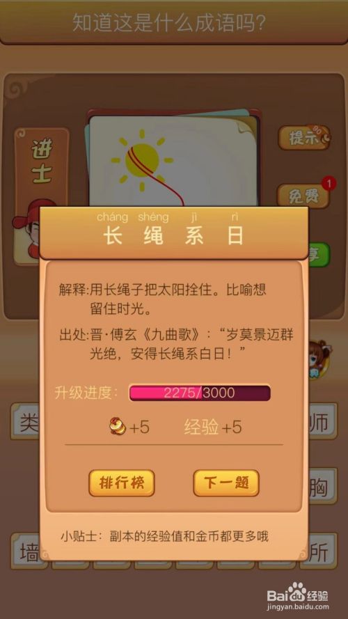 这个成语不是很常见,但是只要知道,还是很容易猜的,首先是有一个太阳,他被一个绳子牵着,绳子的另一端绑在木头上,所以成语是长绳系日,