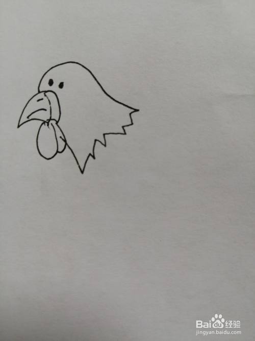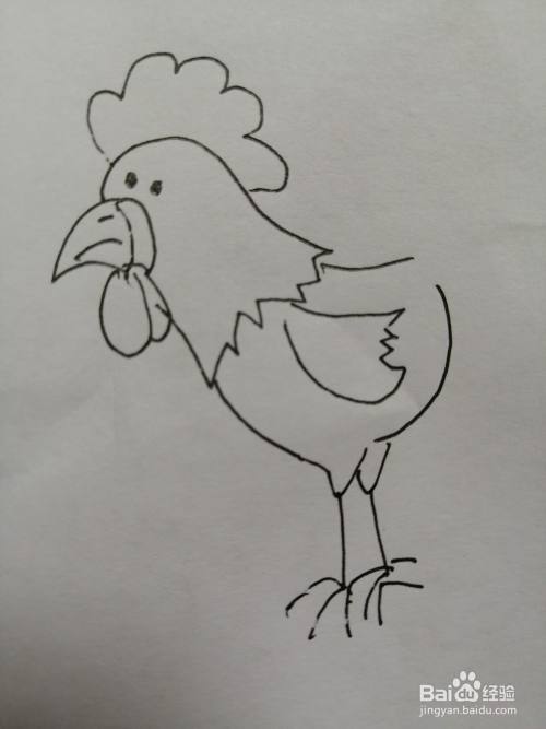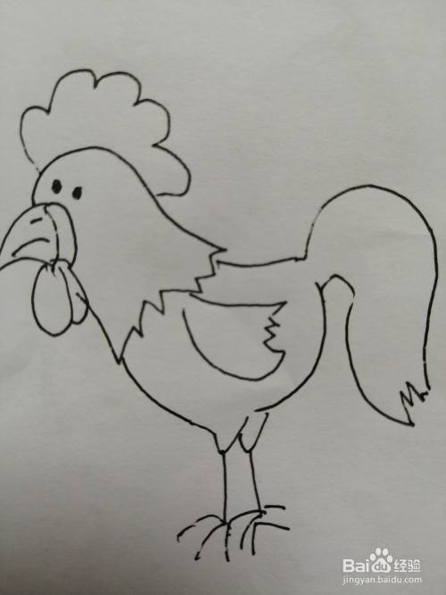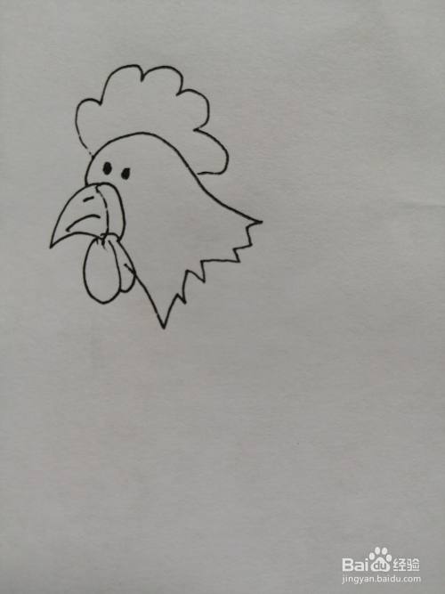 第三步,接着在大公鸡的头顶上和嘴巴下画出鸡冠,注意嘴巴下面鸡冠的画法。