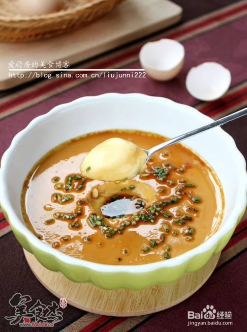 8将生抽与芝麻油混合,倒在蒸好的水蛋上,最后放入葱花即可,如果觉得生抽的味道太浓,可用少量的凉开水稀释一下