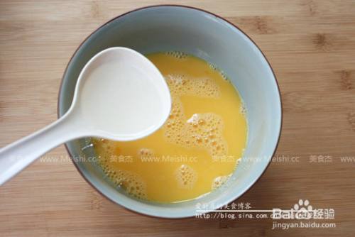 2加入温开水,温开水的用量为蛋液的1.5倍左右