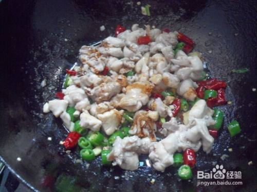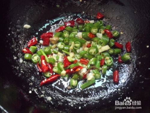 锅留底油放入辣椒、葱、姜、蒜翻炒均匀。