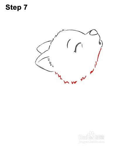 第7步:在下唇下方,为头部底部画一条小线。从耳朵下方开始,为狼小狗的倾斜头部的一侧画出一系列短的中风。当你画毛茸茸的笔画时,将它们向上弯曲以便它们符合顶部的线条。